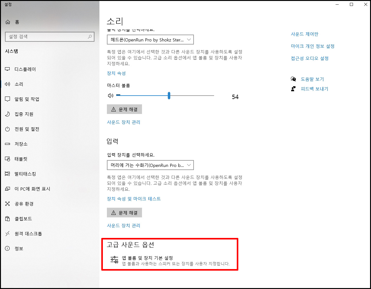연결은 제대로 된 것으로 확인이 됐는데 소리는 안 들리거나 윈도우 작동음은 들리지만, 크롬에서 유튜브를 보는데 소리가 안드리는 경우와 같은 문제가 생겼다면 소리 설정창에서 '고급 사운드 옵션'을 클릭하시길 바랍니다.