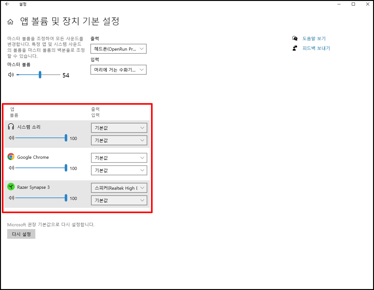 이 때 구글 크롬의 설정값 부분을 이어폰 제품(명)으로 변경해 주거나 기본값으로 설정합니다.