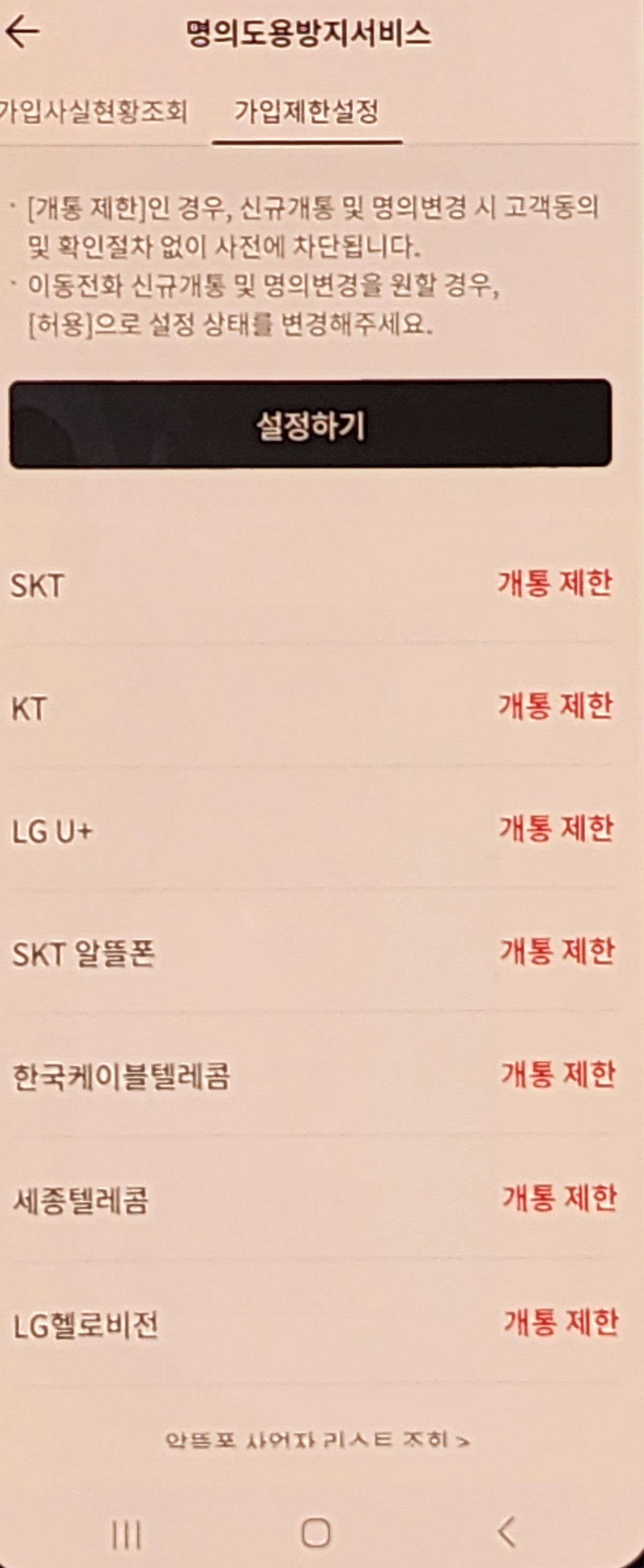 ▪ ‘가입 제한 설정’ → 본인 인증 후 통신사별 차단 기능 활성화