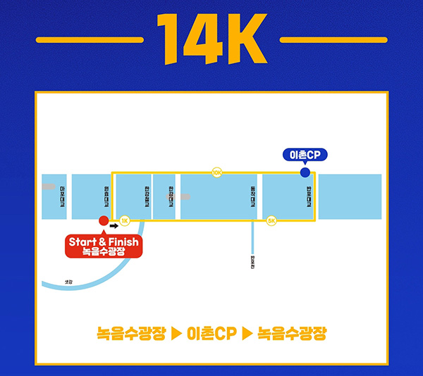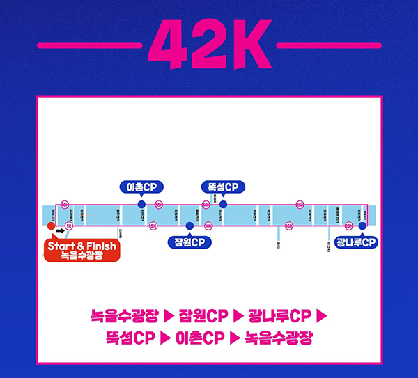 ✅ 전체 코스는 대부분 평지로 이루어져 있으며, 일부 구간에 경사로가 있으나 걷기에 큰 어려움은 없습니다. 단, 42K 풀코스는 실제 마라톤 거리와 유사하기 때문에 체력 분배에 신중해야 합니다.