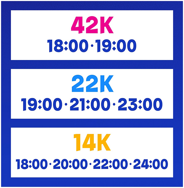 전체 참가자가 12,000명에 이르는 대형 행사인 만큼 출발 시간이 분산되어 있습니다. 티켓팅 시 자신에게 맞는 시간대를 선택할 수 있으니, 본인의 생활 패턴에 맞춰 정하시면 됩니다.