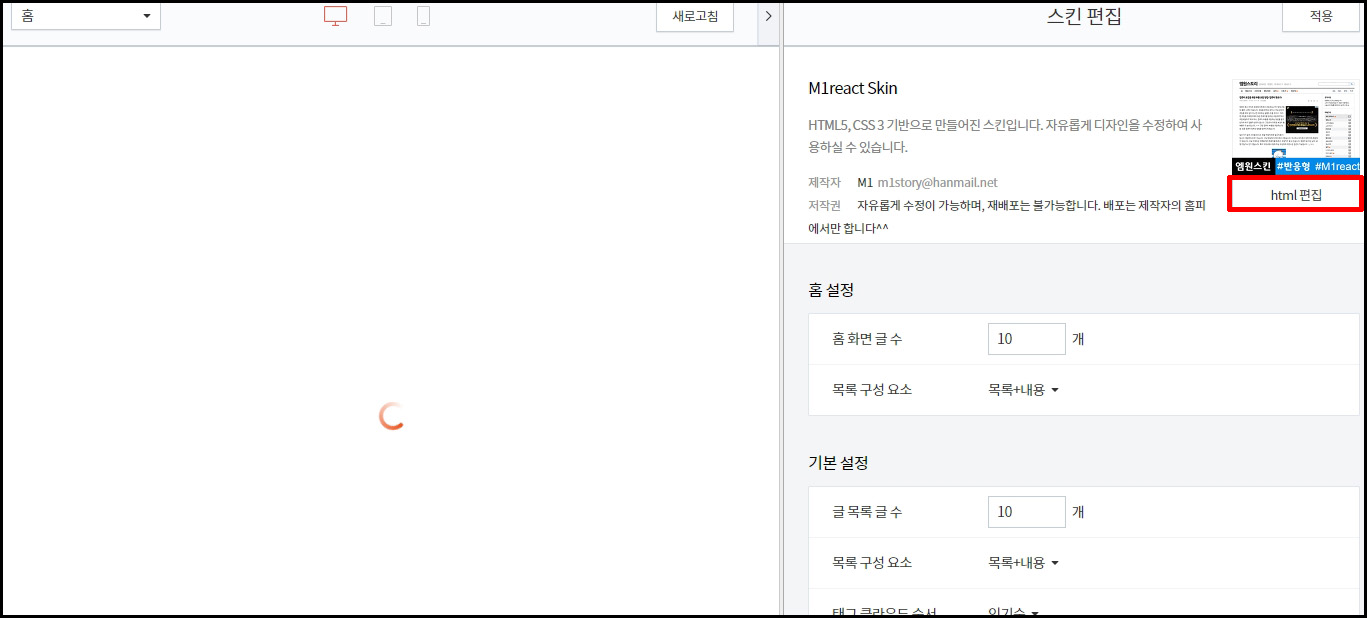 티스토리 설정 페이지에 들어가서 꾸미기 > 스킨 편집 > html 꾸미기를 클릭합니다.