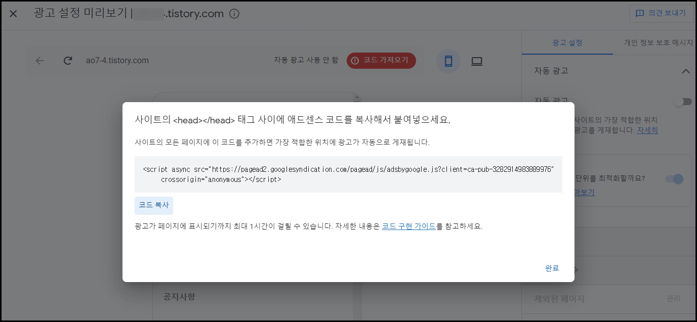 에드센스 승인 검토요청 후 코드 받기.