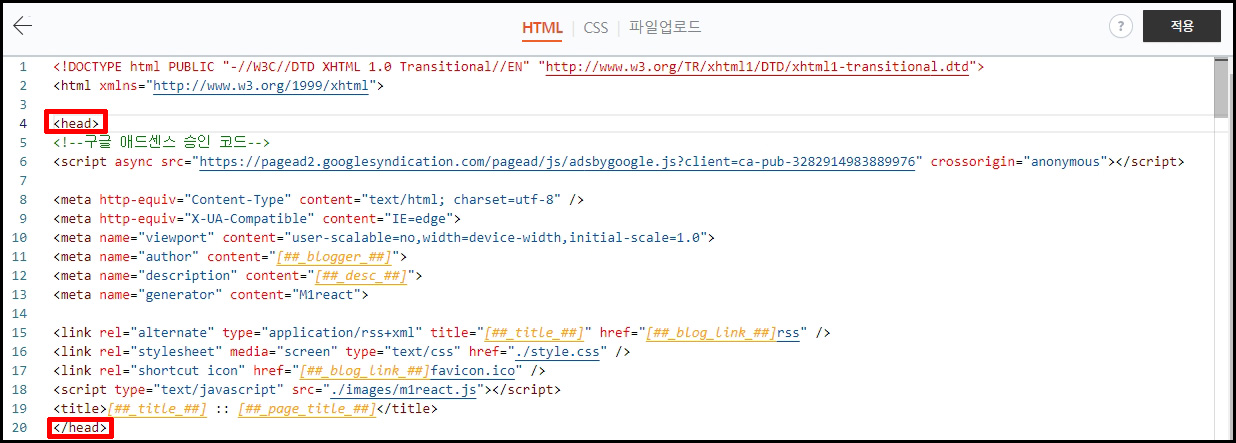 HTML 편집창에서 <head>와</head> 사이에 구글 애드센스 승인 코드를 삽입해 줍니다.