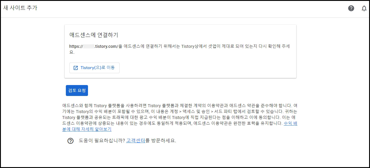애드센스에 연결하고, 승인 검토를 위해서 검토 요청을 합니다.