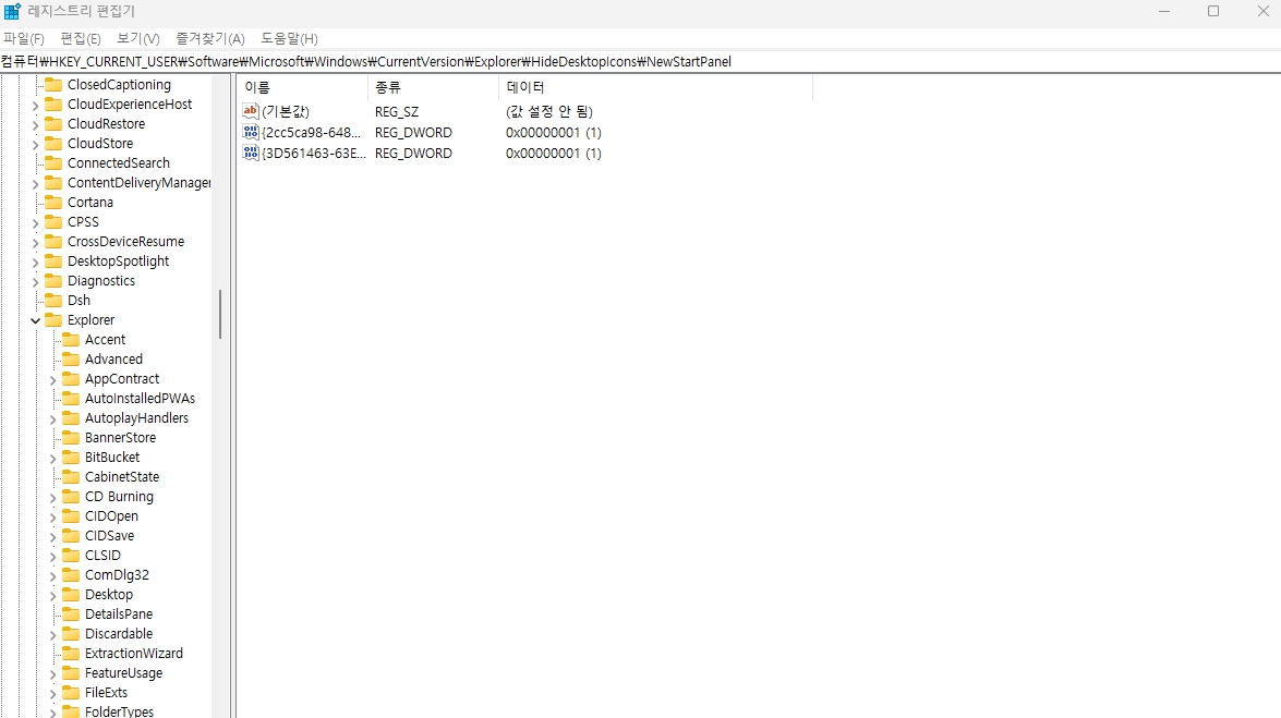 해당 레지스트리 값을 삭제하거나 값 데이터를 0으로 변경하면 아이콘이 다시 나타납니다.