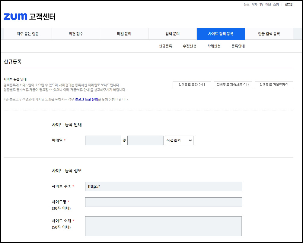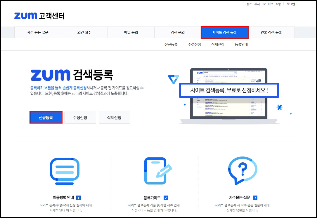 줌 접속 > 고객센터(페이지 제일 하단) > 사이트 검색 등록 > 신규등록