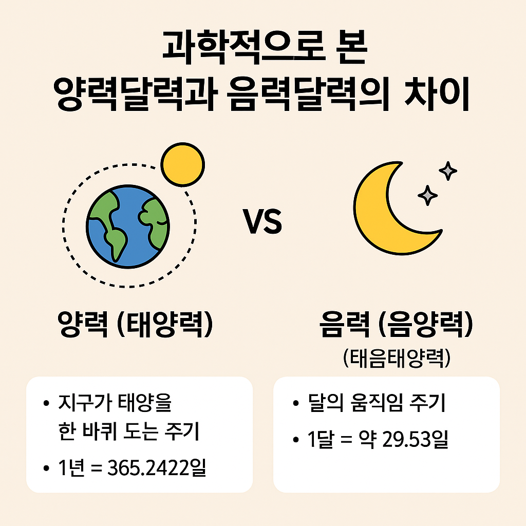 ⚖️ 3. 양력과 음력의 핵심 차이 비교1 기준의 차이양력(태양력): 지구의 태양 공전