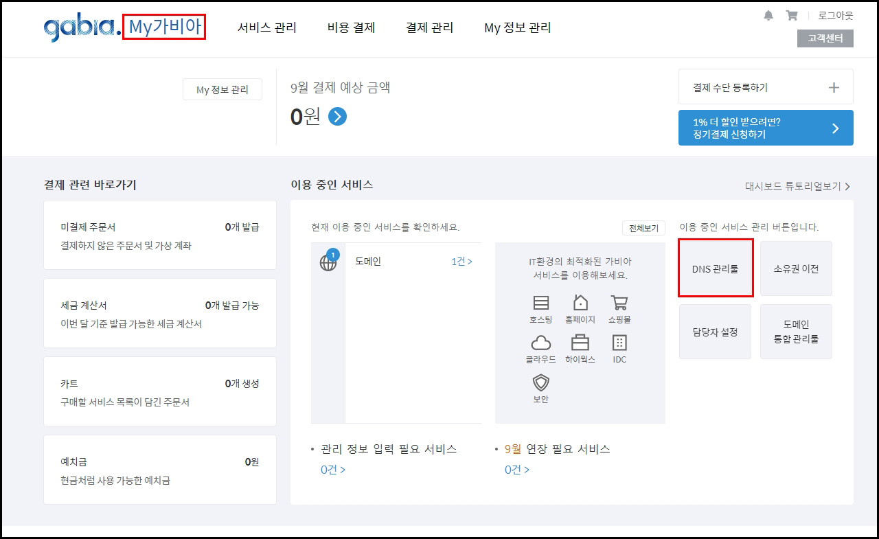 여러 도메인 서비스가 있지만, 그 중에서 가비아를 예를 들면 다음과 같습니다.