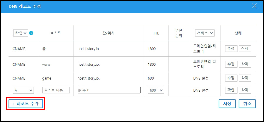 DNS 관리 > 레코드 수정 > 레코드 추가