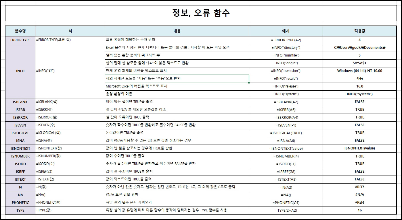 "자동" 또는 "수동"으로 반환=INFO("recalc") 자동 Microsoft Excel의 버전을 텍스트로 표시 =INFO("release") 16.0 운영 환경의 이름 =INFO("system") INFO("system") N, NA 함수