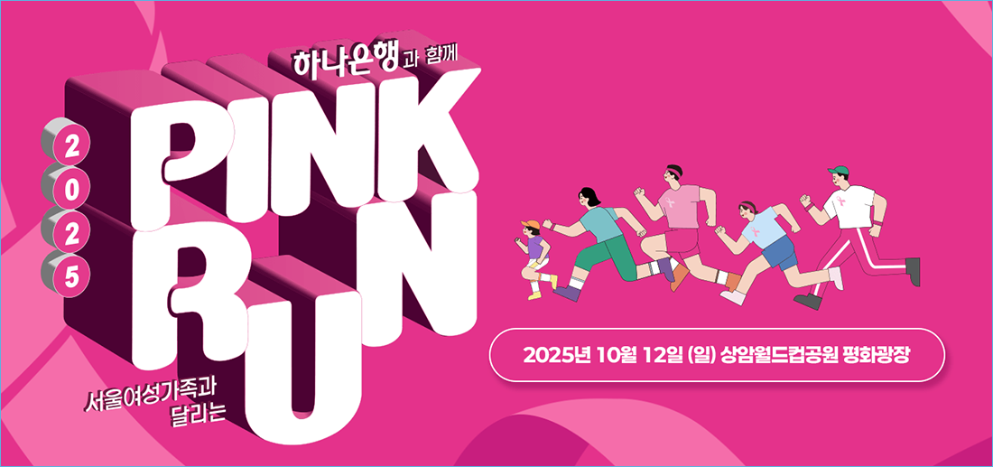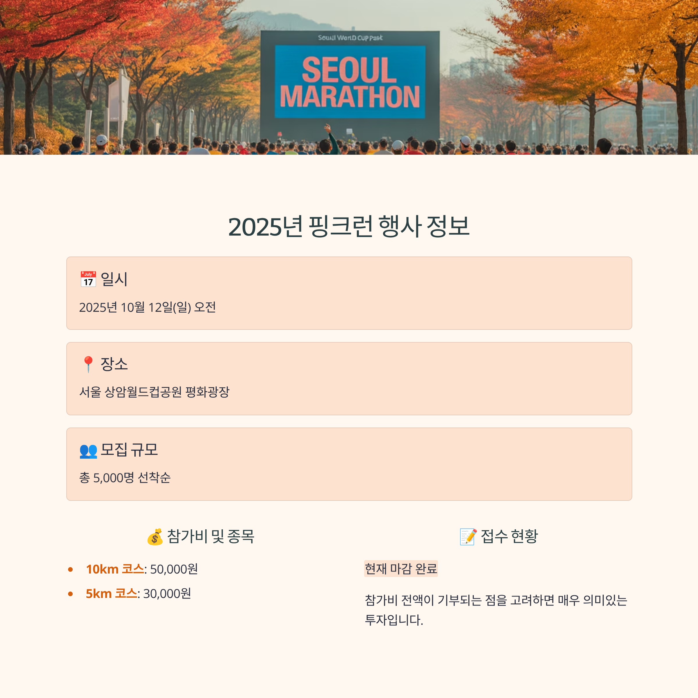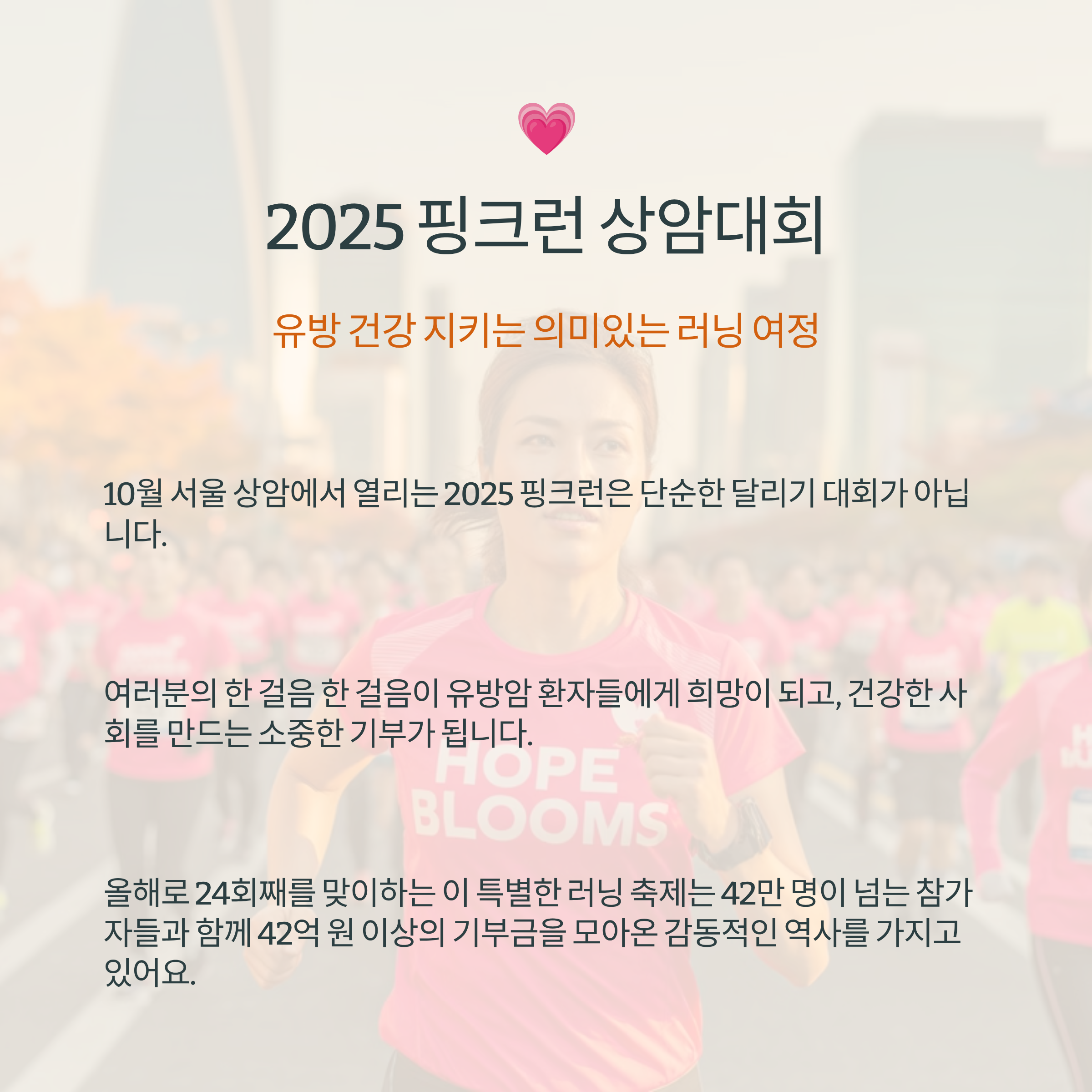 10월 서울 상암에서 열리는 2025 핑크런 대회는 여러분의 한 걸음 한 걸음이 유방암 환자들에게 희망이 되고, 건강한 사회를 만드는 기부가 러닝 행사입니다.