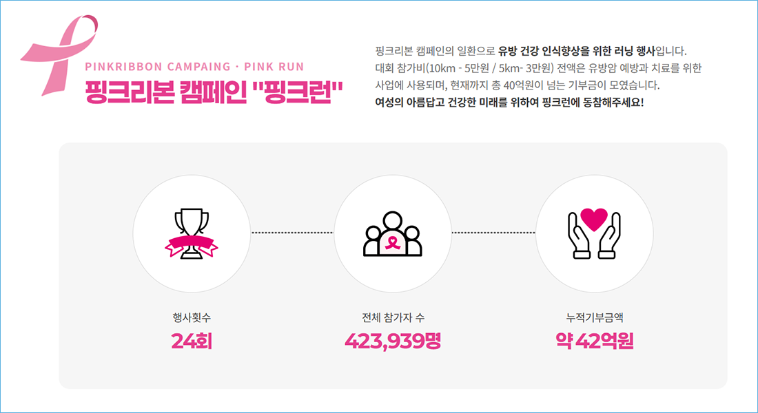 핑크런은 유방 건강 인식 개선과 유방암 예방을 위한 공익 캠페인으로, 러닝과 나눔이 만나는 국내 대표적인 사회공헌 행사입니다.
