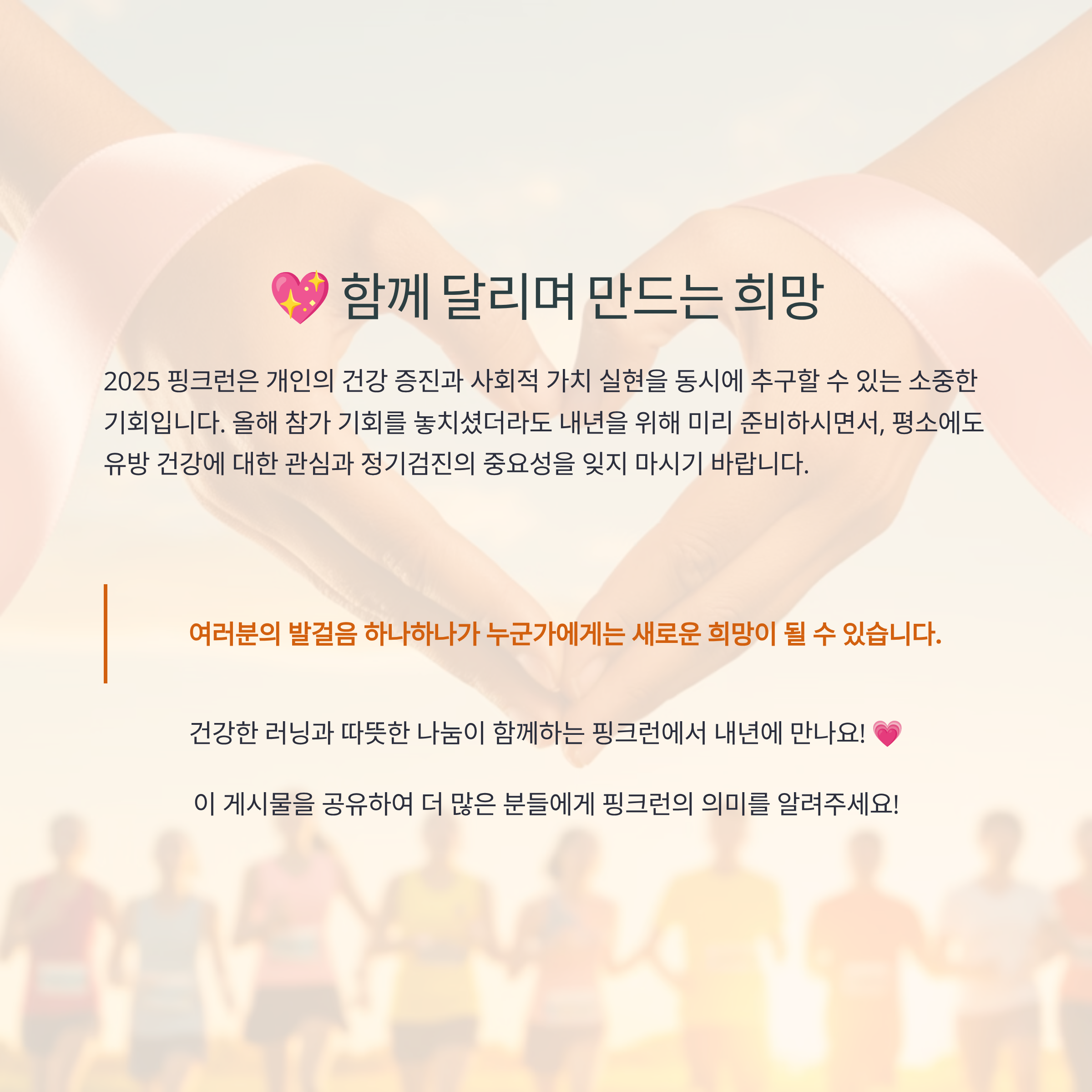 2025 핑크런은 개인의 건강 증진과 사회적 가치 실현을 동시에 추구할 수 있는 소중한 기회입니다.