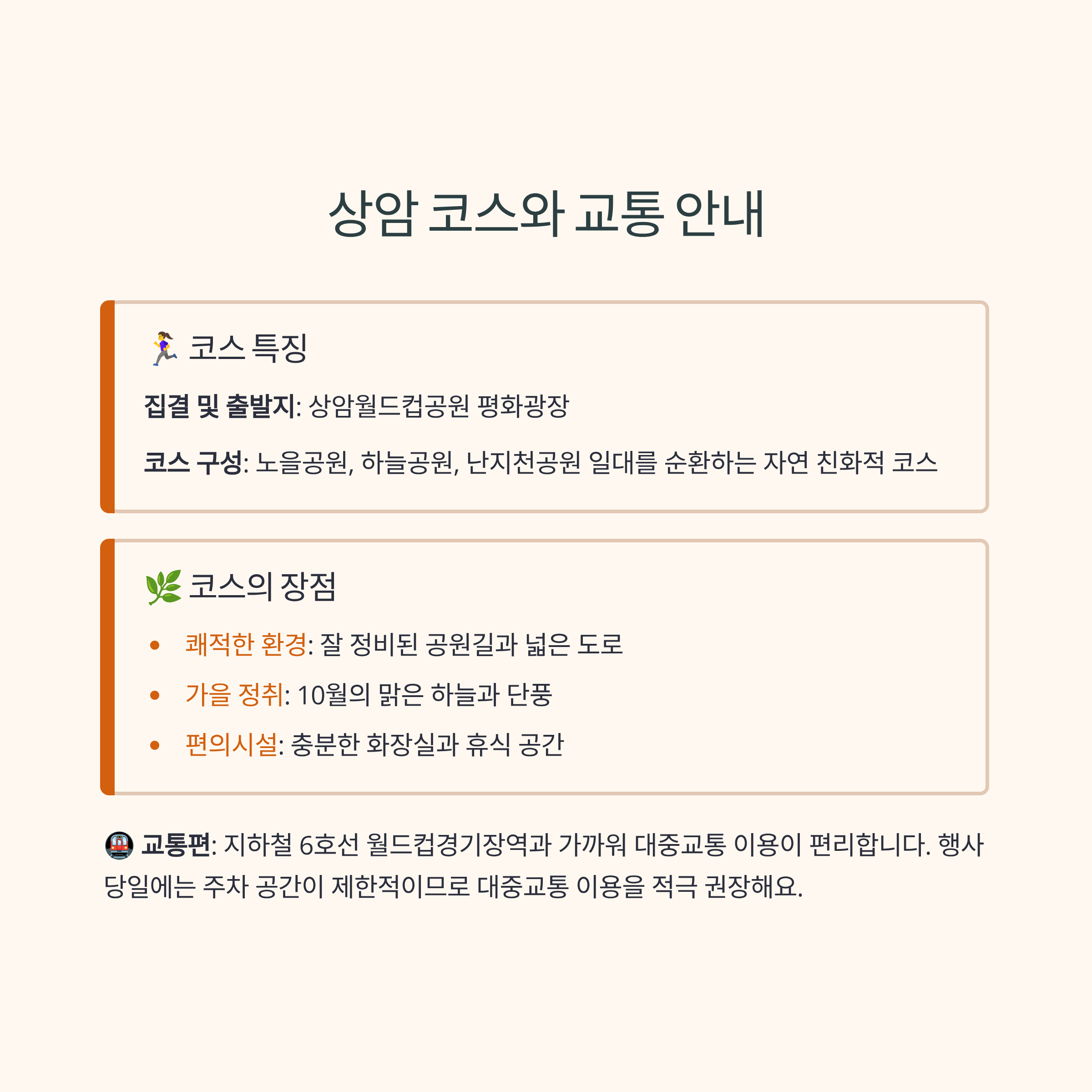 📢 완주 기념품은 매년 행사 당일까지 공개되지 않아 참가자들에게 특별한 기대감을 선사하고 있어요.4. 상암 코스와 교통 안내