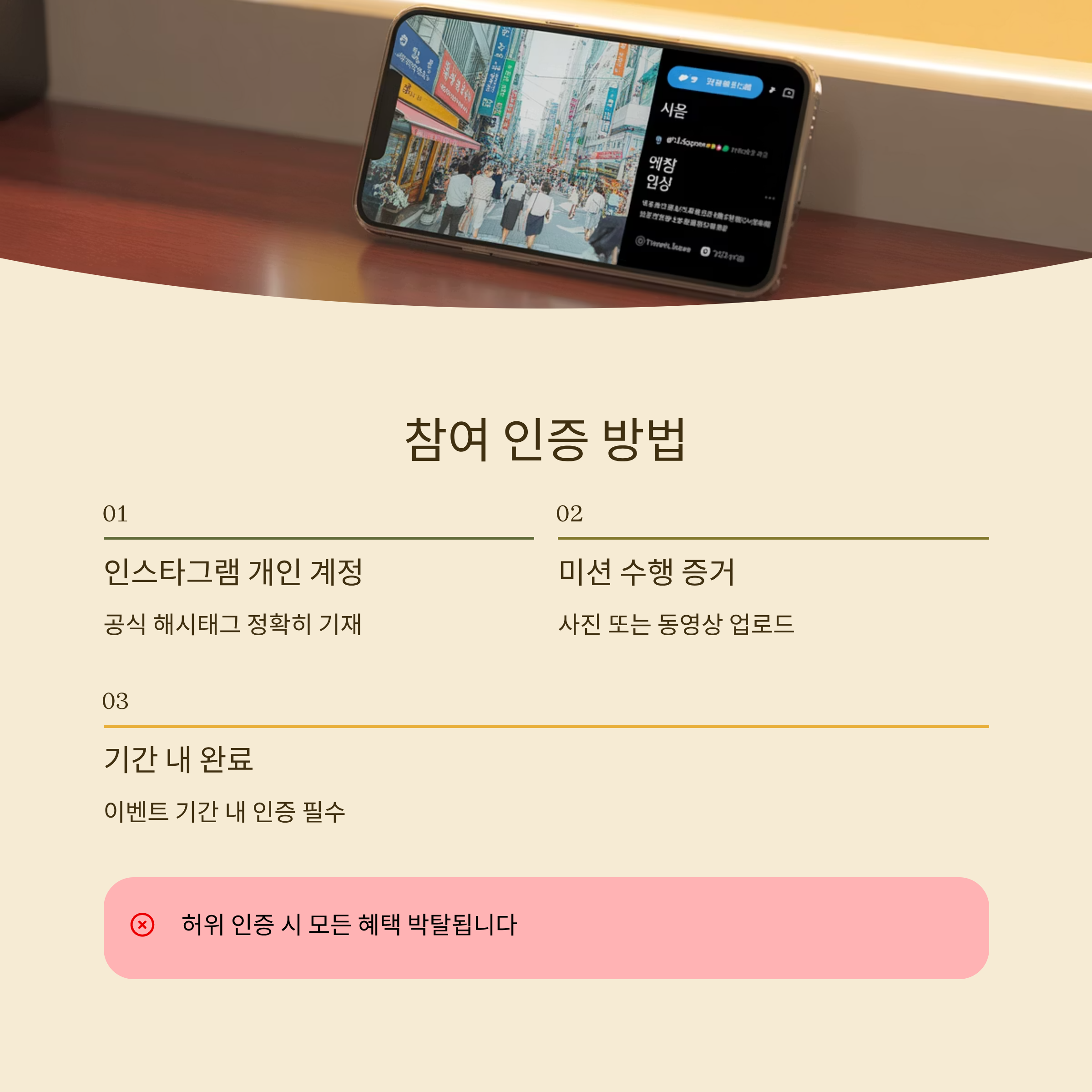 📢 경품은 모두 추첨을 통해 선정되지만, 참여만 해도 받을 수 있는 기본 기념품만으로도 충분한 가치가 있습니다.참여 인증 및 유의사항