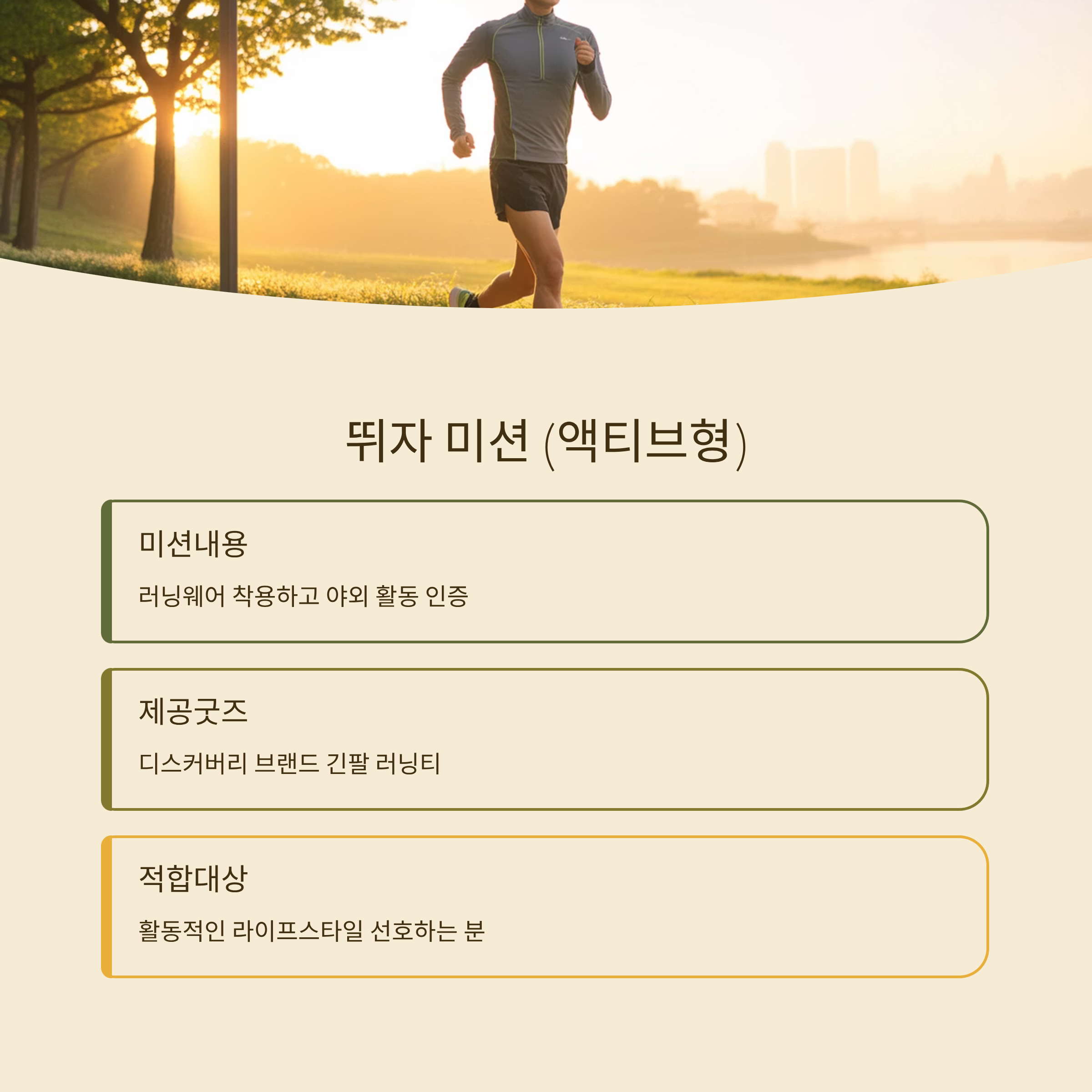 이 이벤트는 단순한 마케팅 이벤트를 넘어서, 바쁜 현대인들에게 건강한 여가생활과 소소한 즐거움을 선사하는 의미 있는 캠페인입니다. 참가비 부담 없이 고품질 기념품을 받을 수 있고, 본인의 성향에 맞는 미션을 선택할 수 있어 부담이 전혀 없습니다.