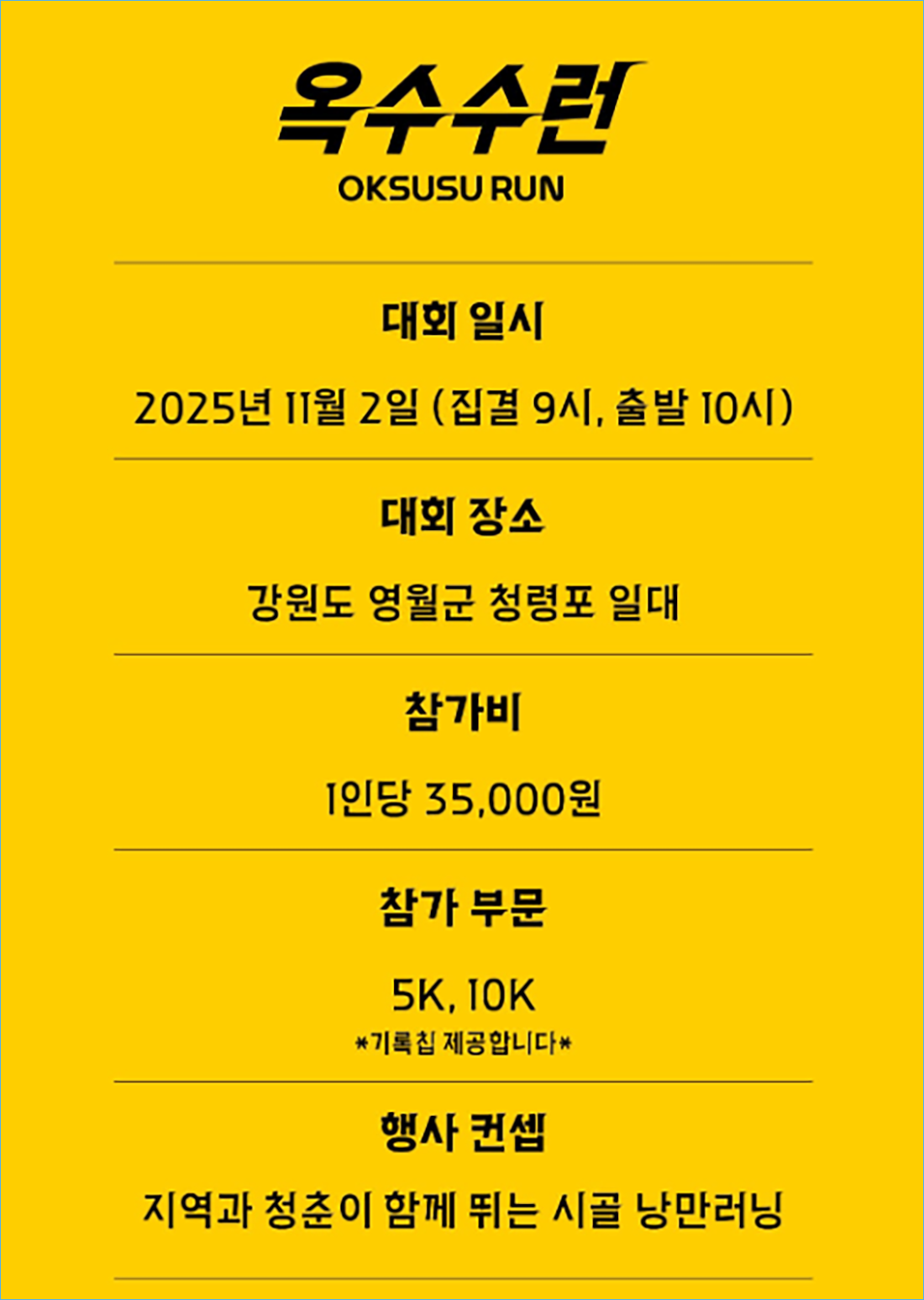 2025년 11월 2일, 강원도 영월에서 개최되는 영월 옥수수런 2025는 도심 마라톤과는 또 다른 매력을 선사합니다.
