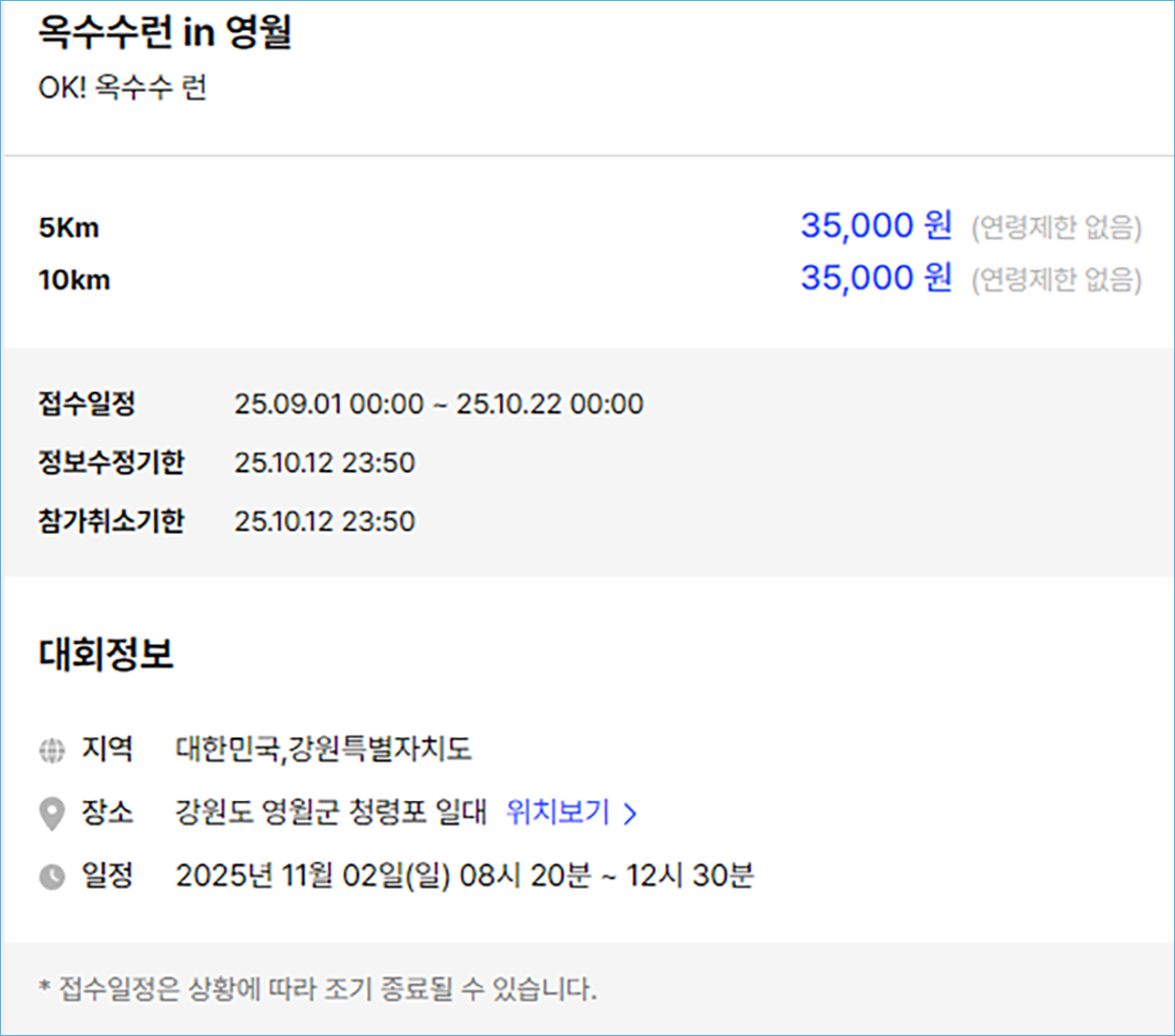 영월 옥수수런 2025의 출발은 10시에 진행되며, 5km와 10km 코스는 10분 간격으로 출발합니다. 시골 지역 특성상 출발 시간이 도심 마라톤보다 조금 늦은 편입니다.
