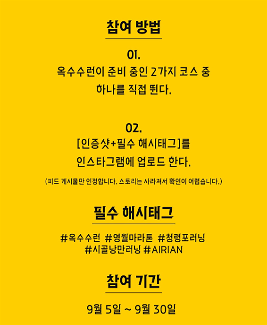 참가 전 사전 이벤트도 진행됩니다. 9월 5일부터 30일까지, 영월 옥수수런 2025 코스를 미리 달리고 인스타그램에 인증하면 추첨을 통해 대회 참가 티켓을 받을 수 있습니다. 두 가지 코스 중 한 가지를 선택하여 참여하면 되고, 필수 해시태그를 반드시 포함해야 합니다.