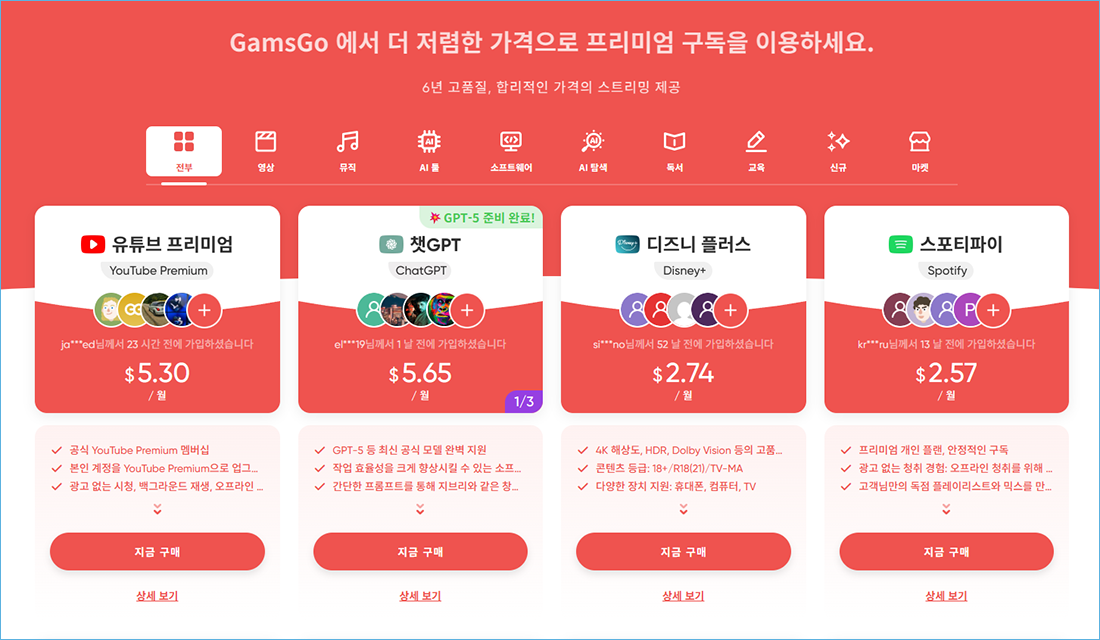겜스고는 유튜브 프리미엄을 비롯해 각종 구독 서비스를 할인된 가격으로 제공하는 플랫폼입니다. 가족 계정처럼 하나의 구독을 여러 사람이 나눠 사용하는 방식으로 운영되기 때문에 개인당 비용이 크게 낮아집니다.