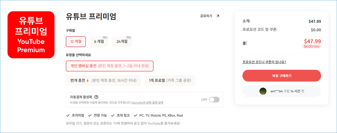 정가 대비 60% 절약겜스고에서 유튜브 프리미엄을 이용하면 다음과 같은 가격으로 구독할 수 있습니다.