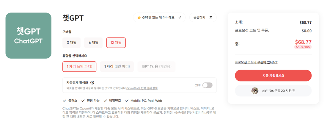 겜스고는 유튜브 프리미엄뿐만 아니라 최근 많은 분들이 관심 갖는 AI 서비스 구독도 제공합니다.챗GPT 할인 가격