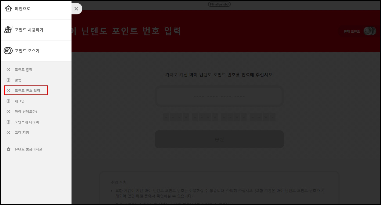 닌텐도 스위치 구입 시 함께 동봉 되어 있던 포인트 번호를 입력합니다.