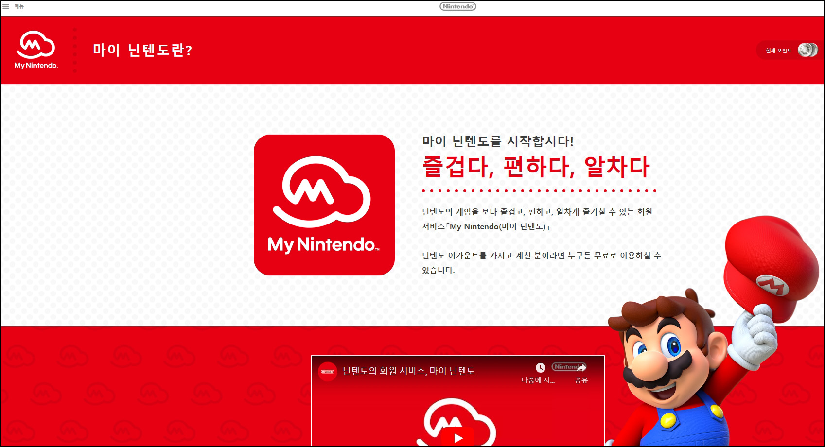 포탈 검색 사이트에서 마이닌텐도를 검색하시면 바로 링크가 뜨고 클릭하면 즐겁다, 편하다, 알차다 표어와 함께 마리오가 보입니다.