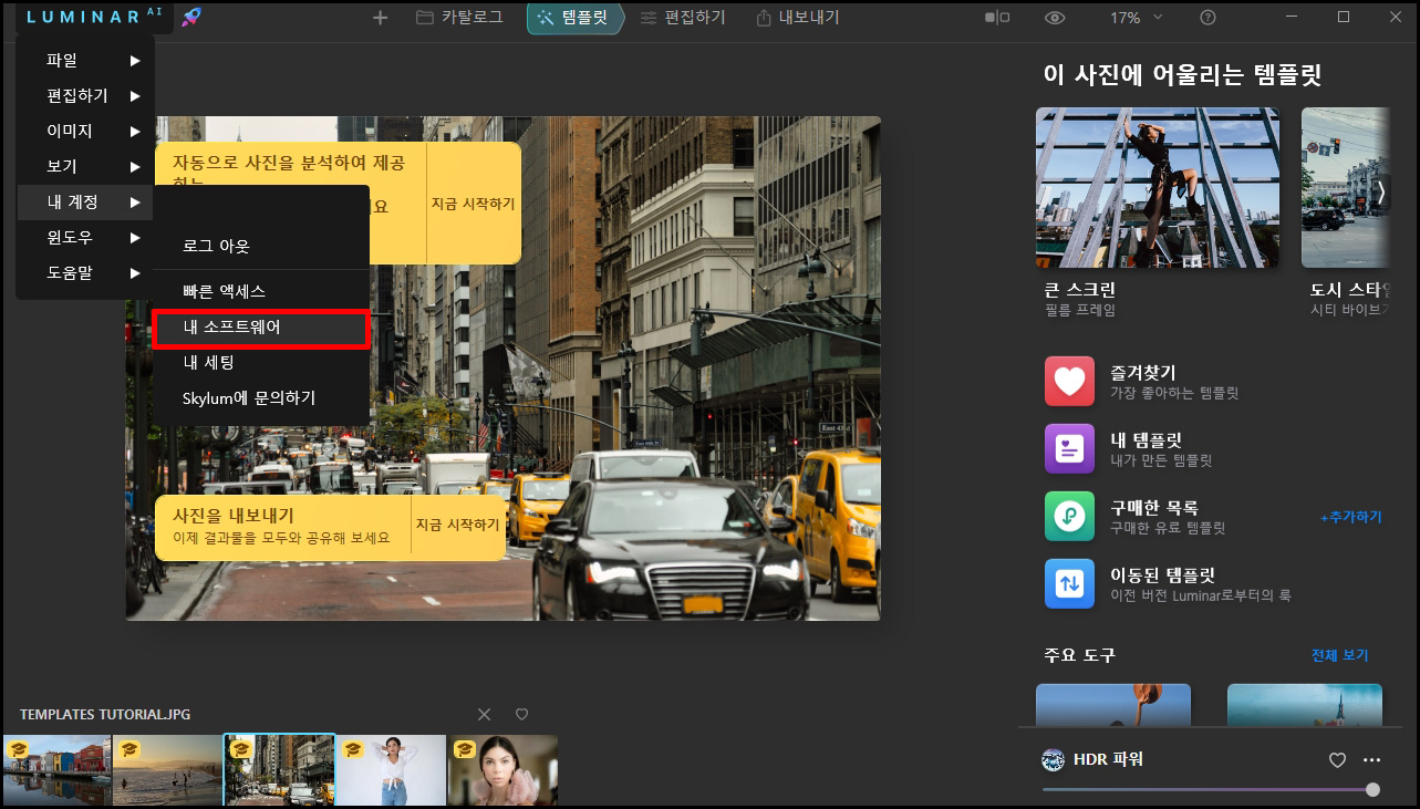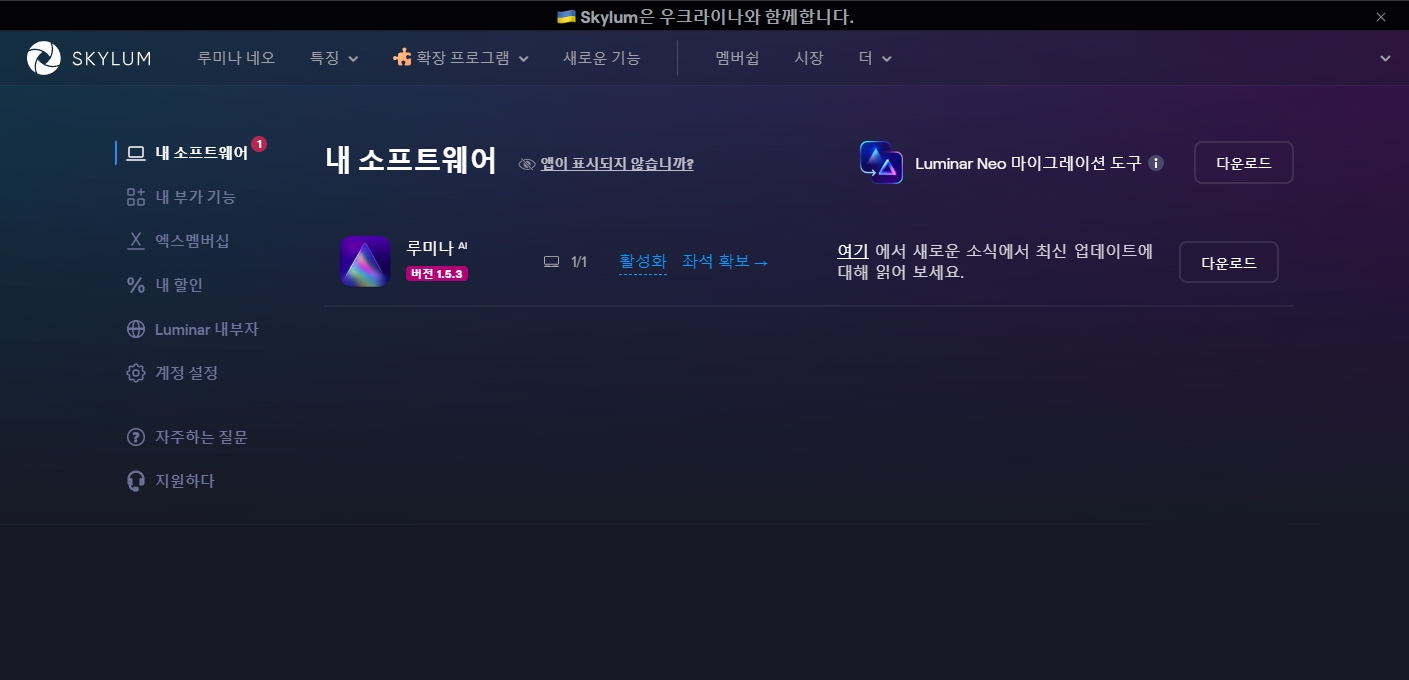 좌측 상단의 루미나AI를 클릭하고, 내 계정에 내 소프트웨어를 클릭합니다.