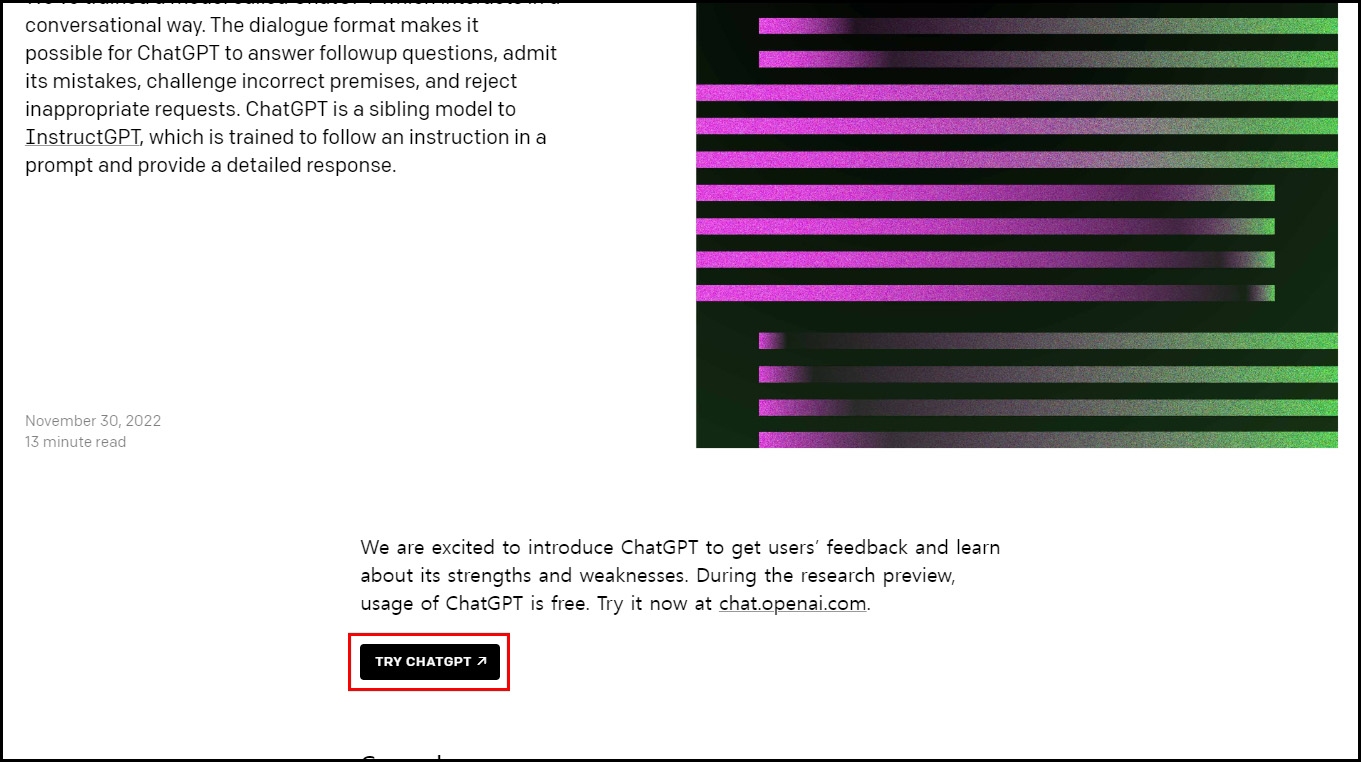 openai 사이트에 접속 후에 스크롤을 조금만 내리면 'TRY CHATGPT' 버튼이 보입니다. 클릭을 하면 ChatGPT를 무료로 사용해 볼 수 있습니다.