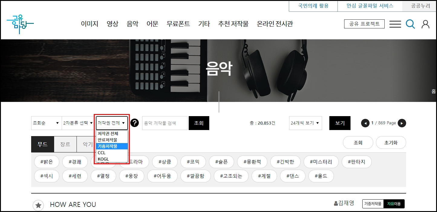 공유마당에 접속 후 상단 메뉴의 음악을 클릭하고, 조회 시 저작권 전체를 클릭합니다. 기능저작물과 만료저작물 등 분류된 메뉴가 나오는데, CCL은 저작권을 표시해야 하는 경우도 있음으로 기증저작물이나 만료저작물을 선택하고 조회를 하는 것이 조금 더 나을 수 있습니다.