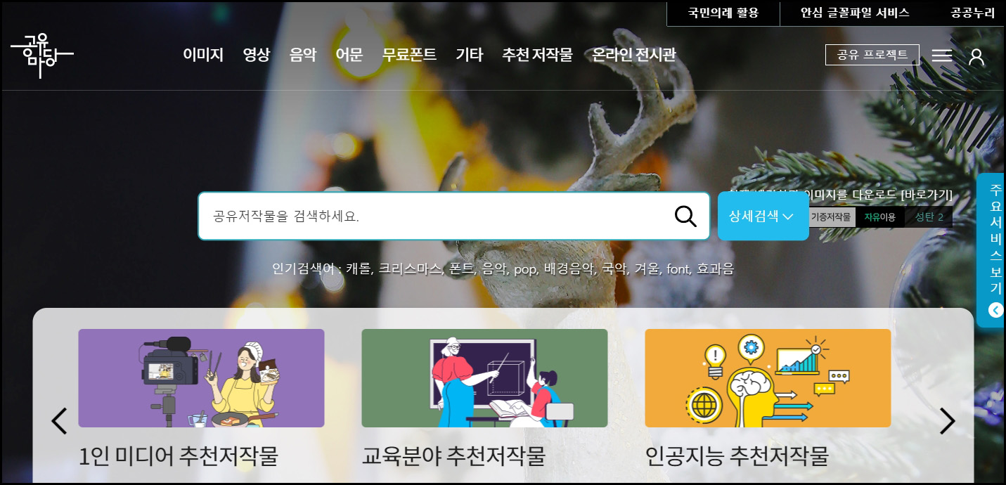 공유마당은 음악 뿐만 아니라 이미지나 영상까지도 무료로 다운로드 받을 수 있습니다. 특히, 공유마당은 저작권이 만료 되었거나 기증한 음원을 모아 놓았기 때문에 무료로 음원을 다운로드 받고 사용할 수 있습니다.