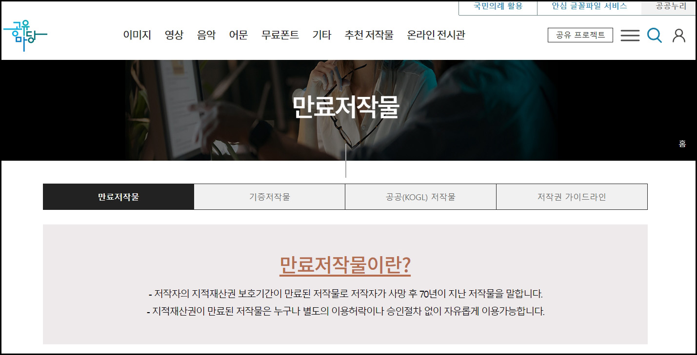 저작권 전체라고 적힌 메뉴 중 저작권의 종류를 선택하고, 옆에 있는 물음표를 클릭하면 저작물에 대한 설명을 볼 수 있습니다. 만료 저작물의 경우 저작자가 사망 후 70년이 지난 것을 의미한다는 등의 내용을 볼 수 있으니 한 번 읽어 보시길 바랍니다.