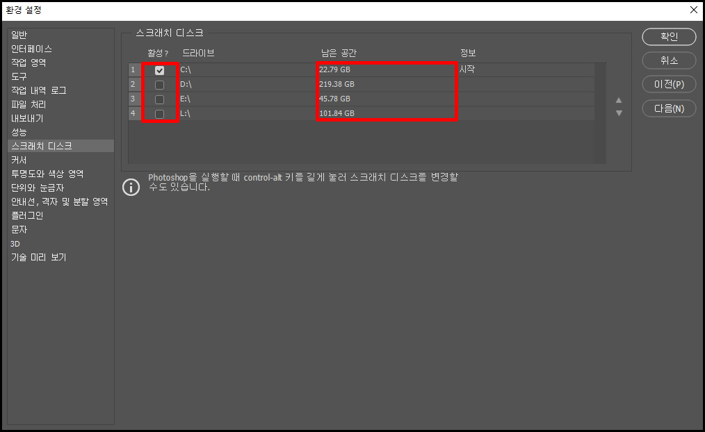 포토샵은 기본적으로 임시로 파일을 저장할 공간을 필요로 합니다.