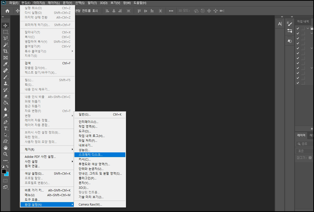 포토샵 스크래치 디스크 용량 확보하는 방법.