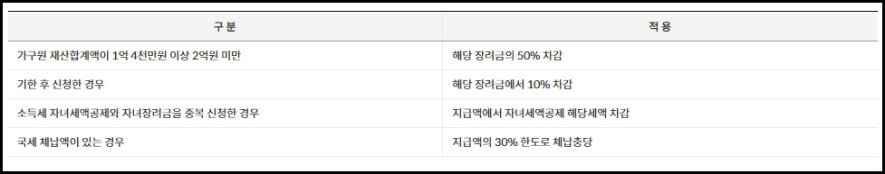 - 가구원 재산 합계액이 1억 4천만원 이상 2억원 4천만 미만 > 50% 차감.