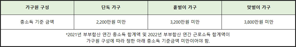 위의 표와 같이 총소득 금액이 단독 가구 2,200만원 미만, 홑벌이 가구 3,200만원 미만, 맞벌이 가구 3,800만원 미만이어야 합니다.