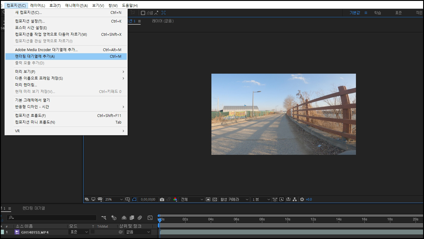 Ctrl + M 기본은 프리미어와 같습니다. 다만, 바로 내보내기가 되는 것이 아니라 렌더링 대기열에 추가가 됩니다. 하단에 보시면 렌더링 대기열이라고 하나 생긴 것이 보이실 겁니다.