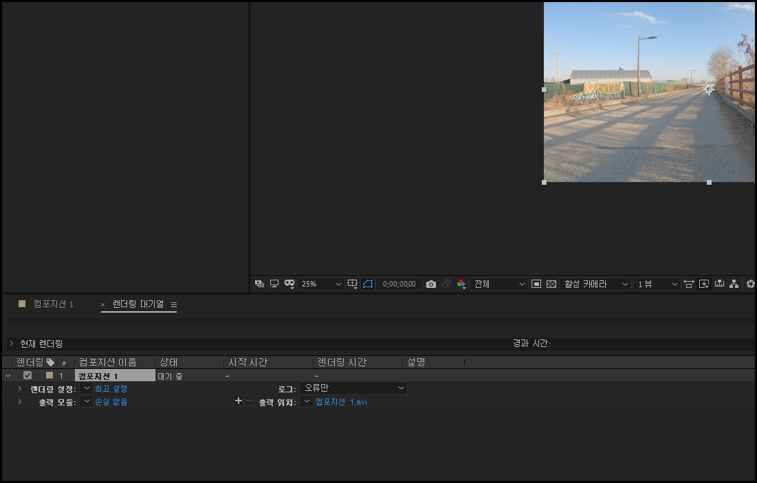 프리미어를 사용하다가 애프터이펙트로 처음 넘어오면 조금 헷갈립니다. 프리미어에서 렌더링을 걸면 새로운 창이 뜨고 설정 후에 클릭하면 바로 시작인데, 애프터이펙트에서는 새로운 창이 아닌 하단에 렌더링 대기가 뜹니다.