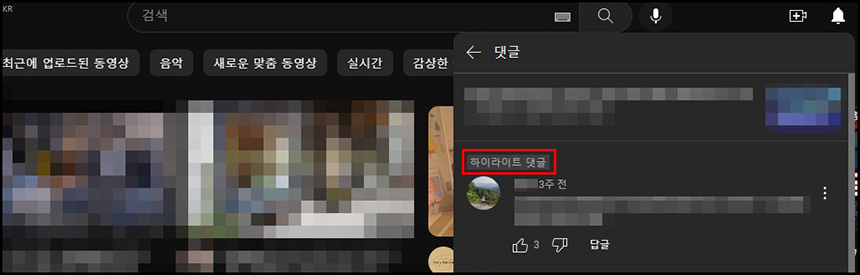유튜브 하이라이트 댓글 : 내가 쓴 댓글을 확인하기 쉽도록 만들어진 기능으로 나만 해당 댓글이 상단에서 보임.