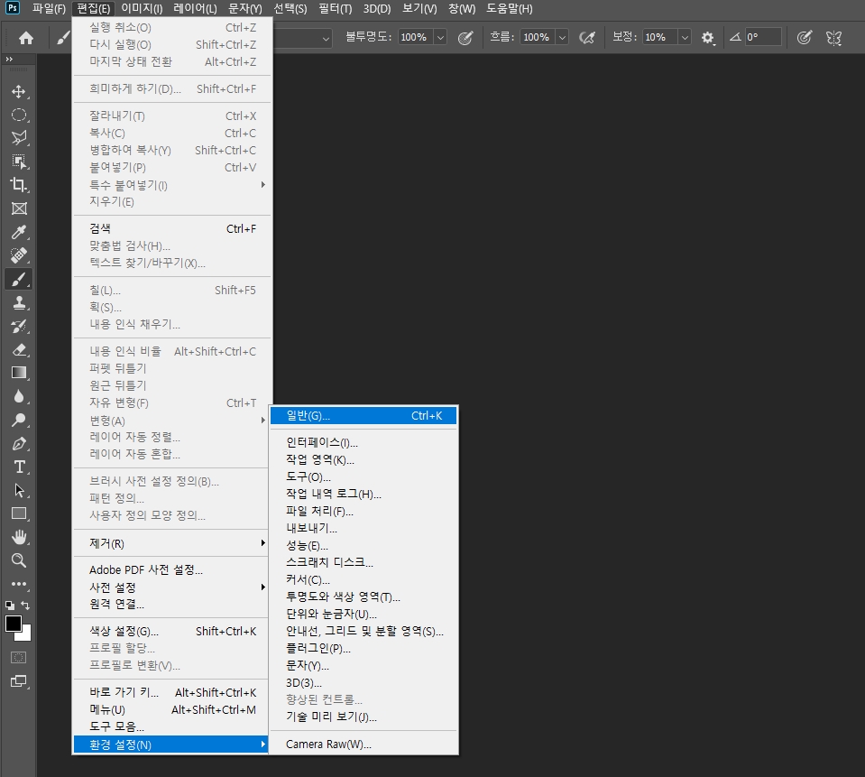 포토샵을 처음 설치했거나 초기화를 시킨 경우 설정이 필요한데, 설치 후 사용하다보면 초기 설정 방법을 잊어버리는경우가 많습니다. 하지만, 생각 외로 간단한 부분이어서 어렵지 않게 설정을 바꿀 수 있습니다.