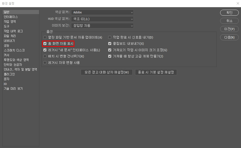 초기 상태에는 환경 설정의 일반창의 옵션에 '홈 화면 자동으로 표시'에 체크 된 것이 보입니다.