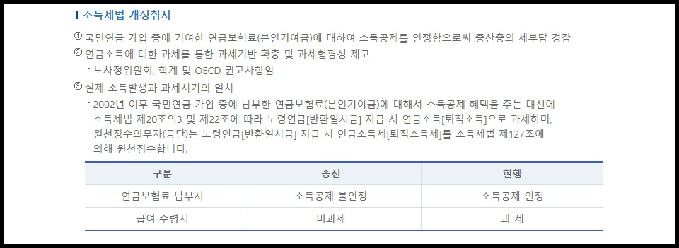 소득세법 개정에 따른 과세에 따라 연금 납입금에 대해서는 비과세로 소득공제가 인정되지만, 받을 때는 연금 소득으로 과세 되어 국민연금 예상수령액에서 감액된다고 봐야 합니다. 장애연금과 유족연금은 비과세 대상이나 보통은 노령연금임으로 대부분 세금을 내야합니다.