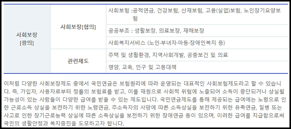 보험원리에 따라 운영되는 대표적인 사회보험제도. 즉, 노후 경제 대책으로 국민연금을 통해 노인이 되었을 때도 근로소득이 상실되지 않고, 유지 될 수 있도록 조금씩 돈을 모아두어 달마다 일정 금액을 받아서 노후 생활비 등으로 사용할 수 있도록 한 제도라고 할 수 있습니다.
