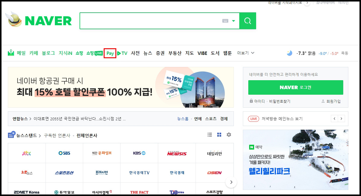 네이버페이 쿠폰등록을 위해선 일단, 네이버에 접속 후 상단의 Pay를 클릭합니다.
