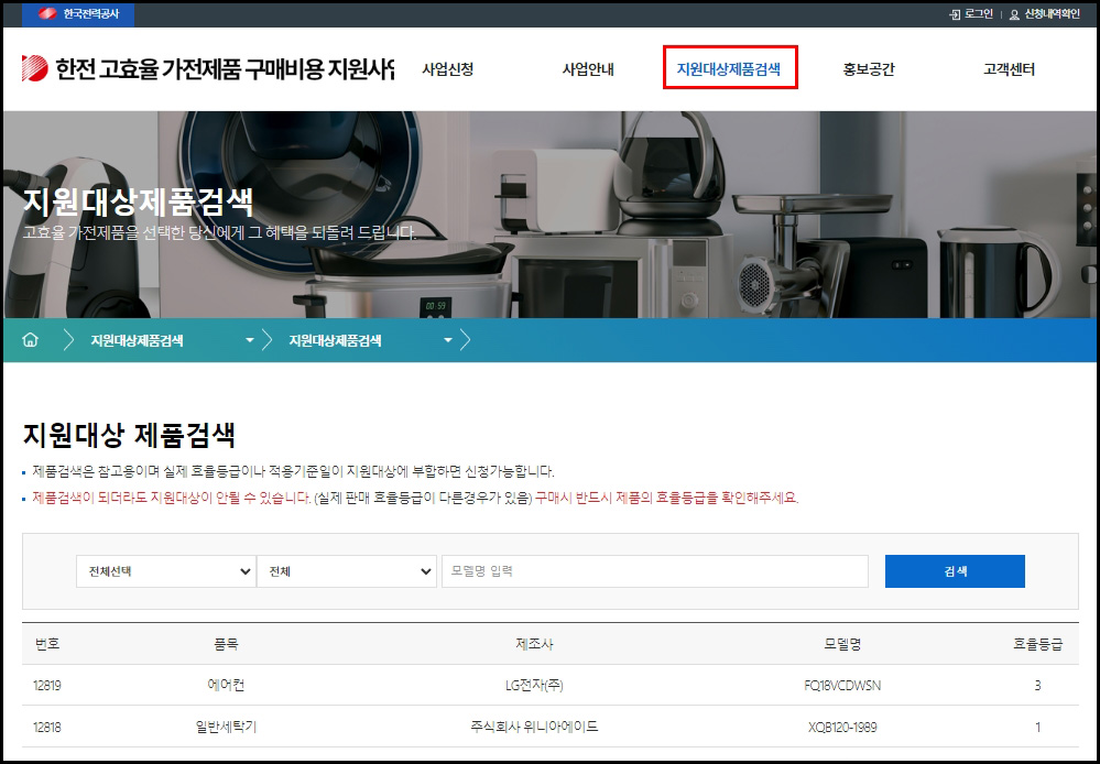 한전 고효율 가전제품 구매비용 지원사업 확인 사항.