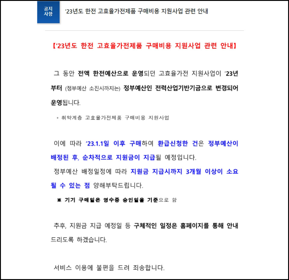 한전 예산으로 전액 운영되던 것 과는 달리 정부 예산(전력 산업 기반 기금)으로 변경 되었기 때문에 2023년도 1월 1일 이후 구매한 경우엔 정부 예산 배정 후에 순차적으로 지원금이 지급된다고 하니 참고하시길 바랍니다.