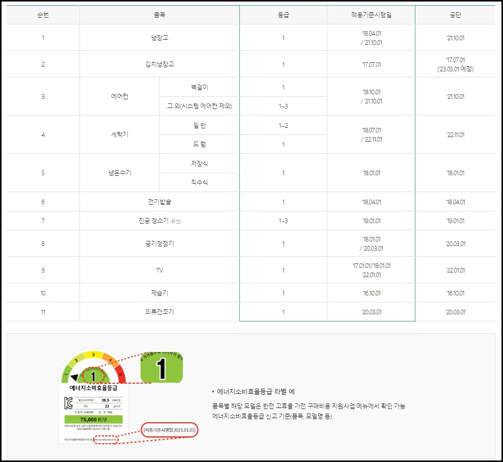 에너지 소비 효율 등급 기준은 제품마다 달라 1등급을 요구하는 경우도 있으며 1~3, 1~2등급을 요구하는 경우도 있습니다. 품목 외 실제 어떠한 모델이 해당 되는지 검색을 통해 확인해 보실 수 있습니다.